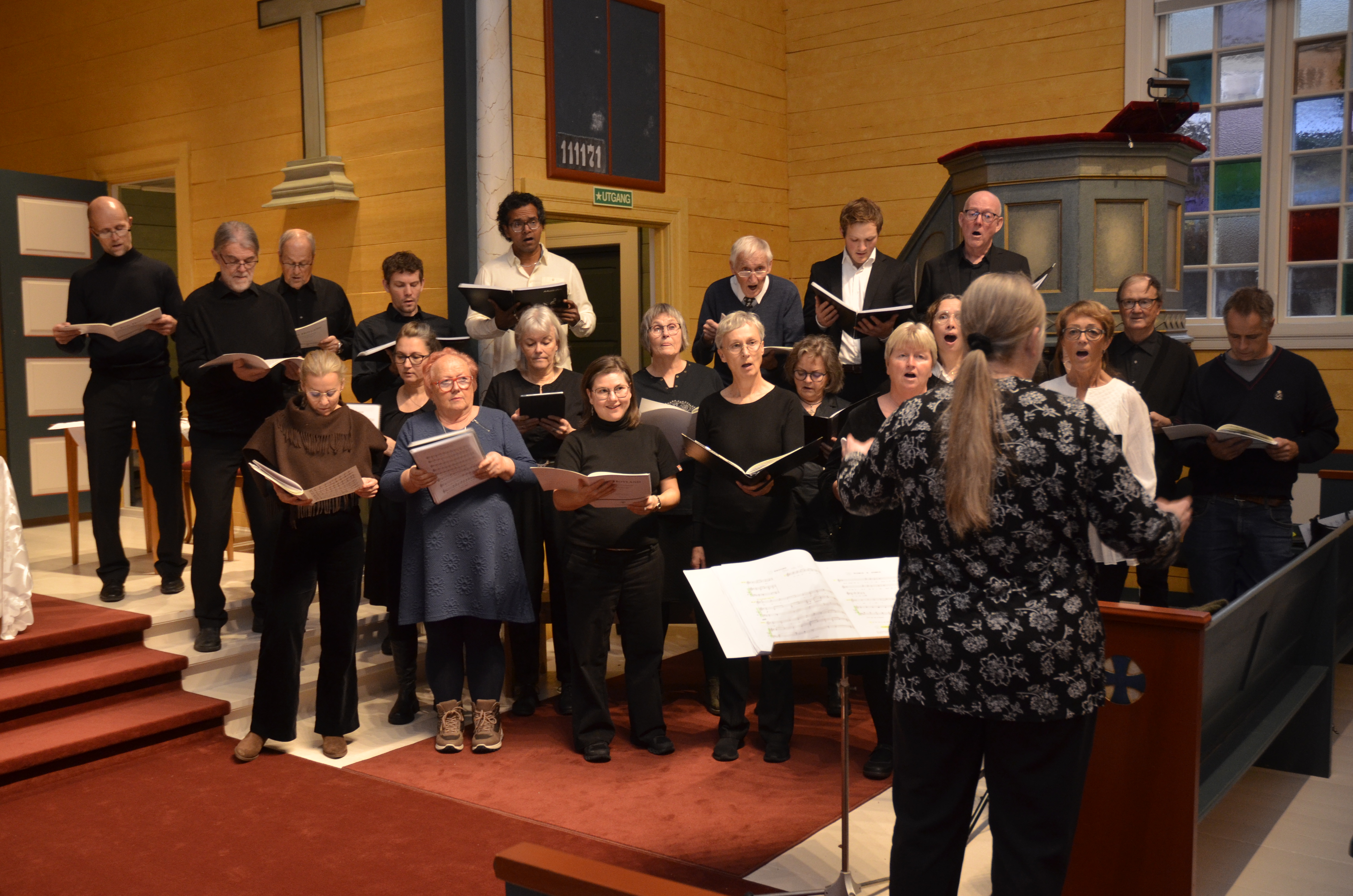 Kor med lokale songarar under leiing av kantor Solveig Meling Johannessen.