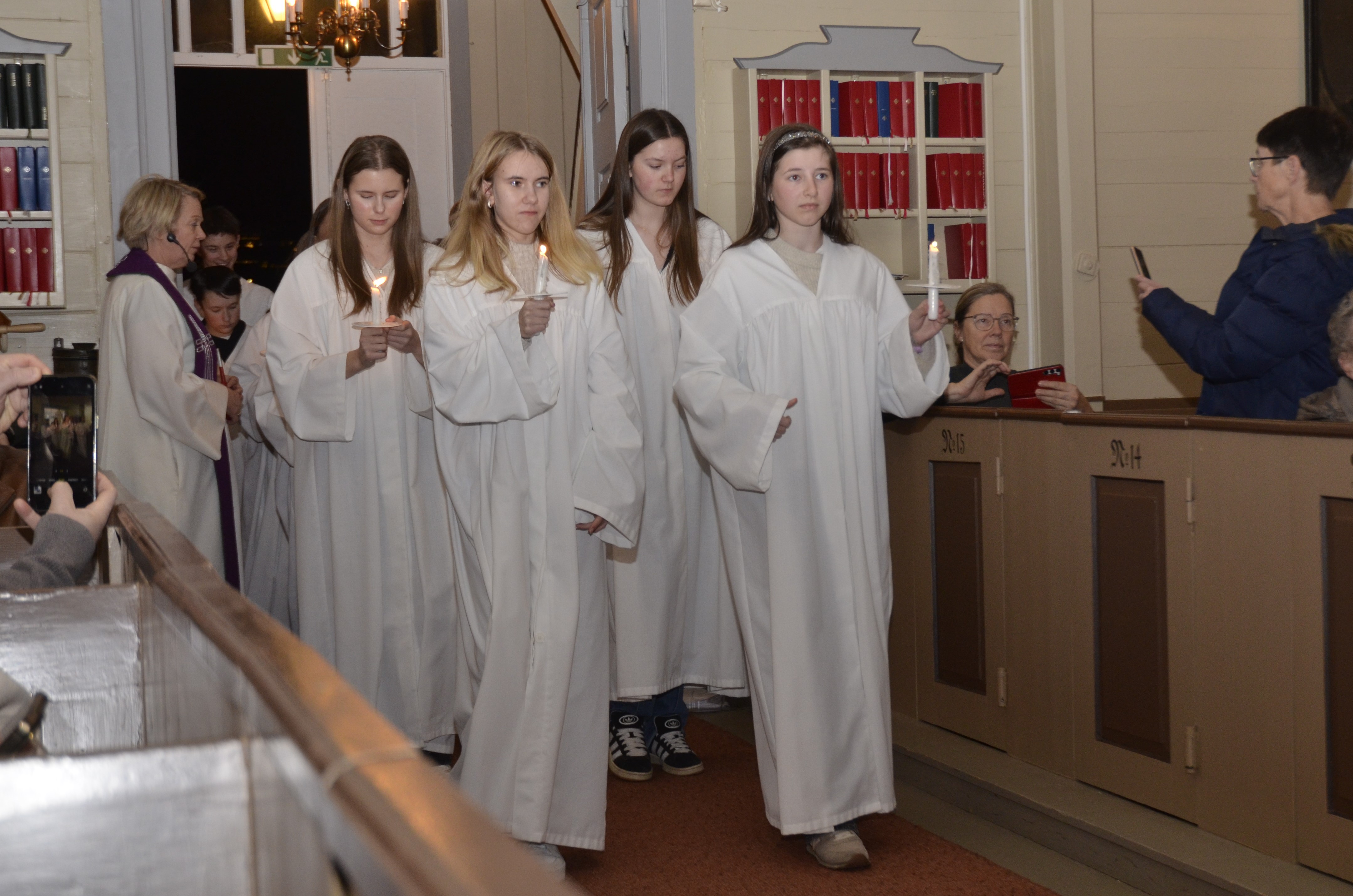 Konfirmantar kjem inn med lys i Vats kyrkje 7. desember. Foto Kjell S. Bakke