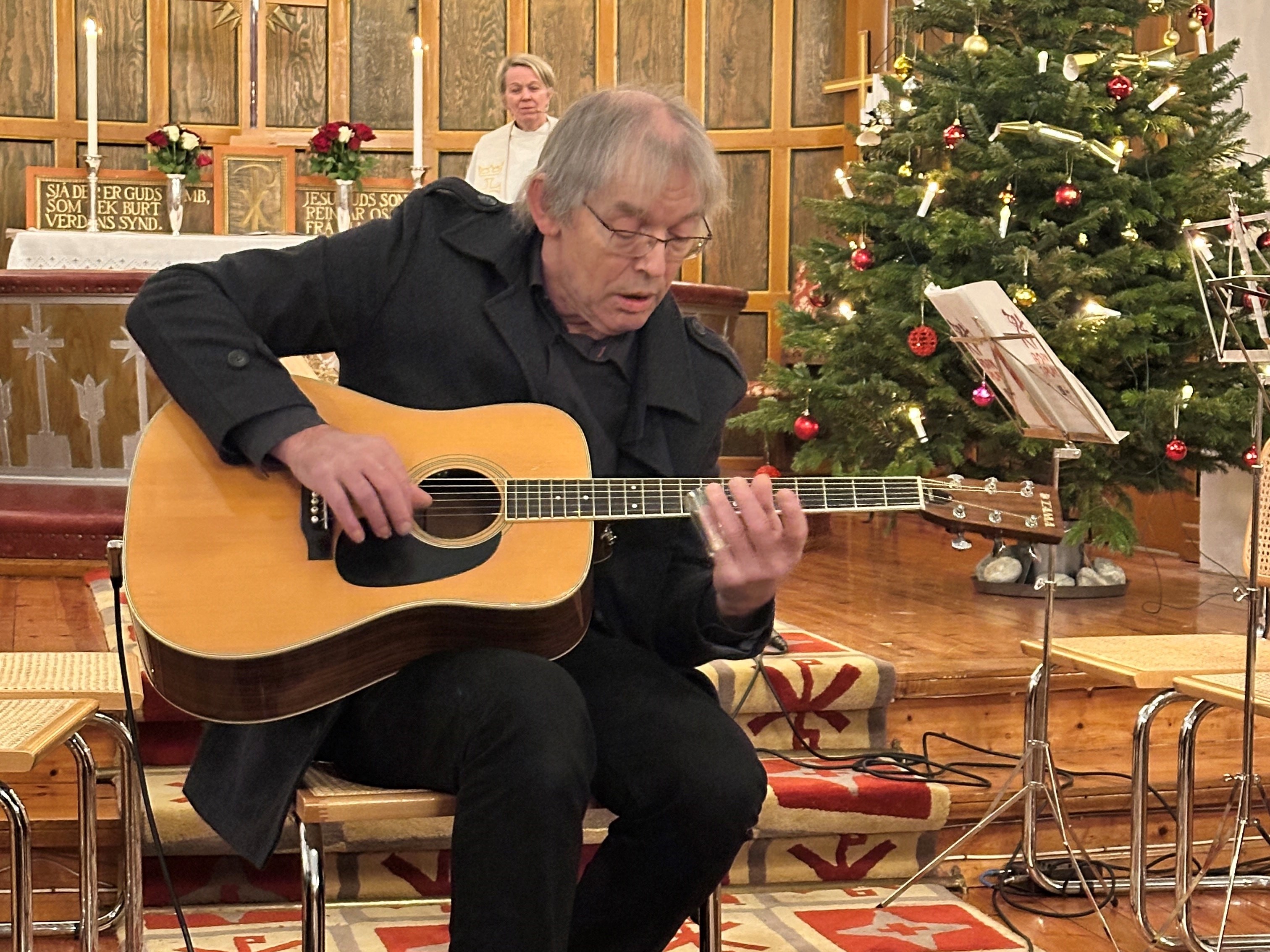 Helge Veastad på gitar i samspel med Arne Tveit på kyrkjeorgelet.