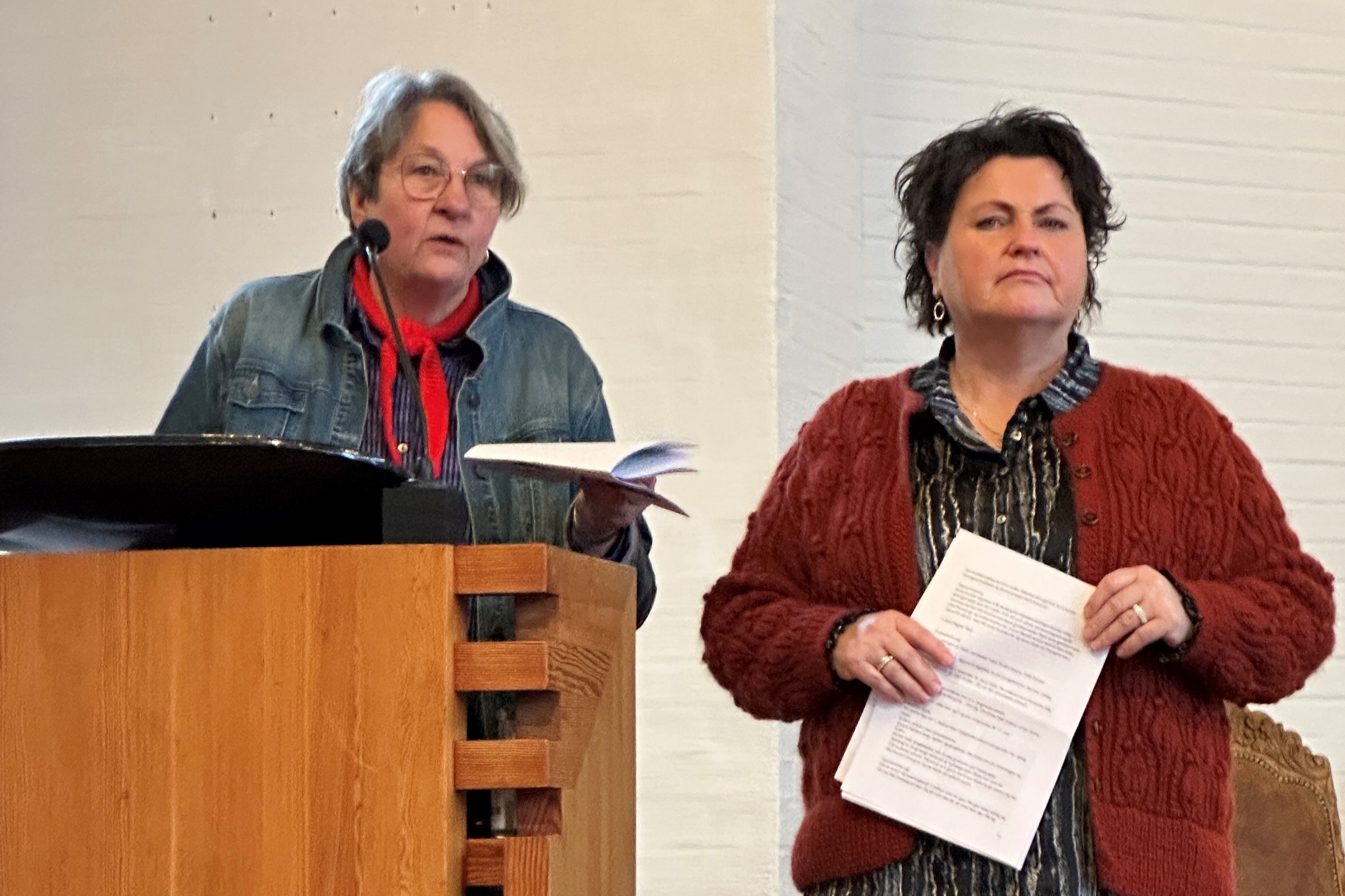 Soknerådet for Skjold, Vats og Vikebygd heldt årsmøte etter gudstenesta i Skjold kyrkje 8. mars 2025. Ny og tidlegare soknerådsleiar skifte på å ha ordet i møtet.